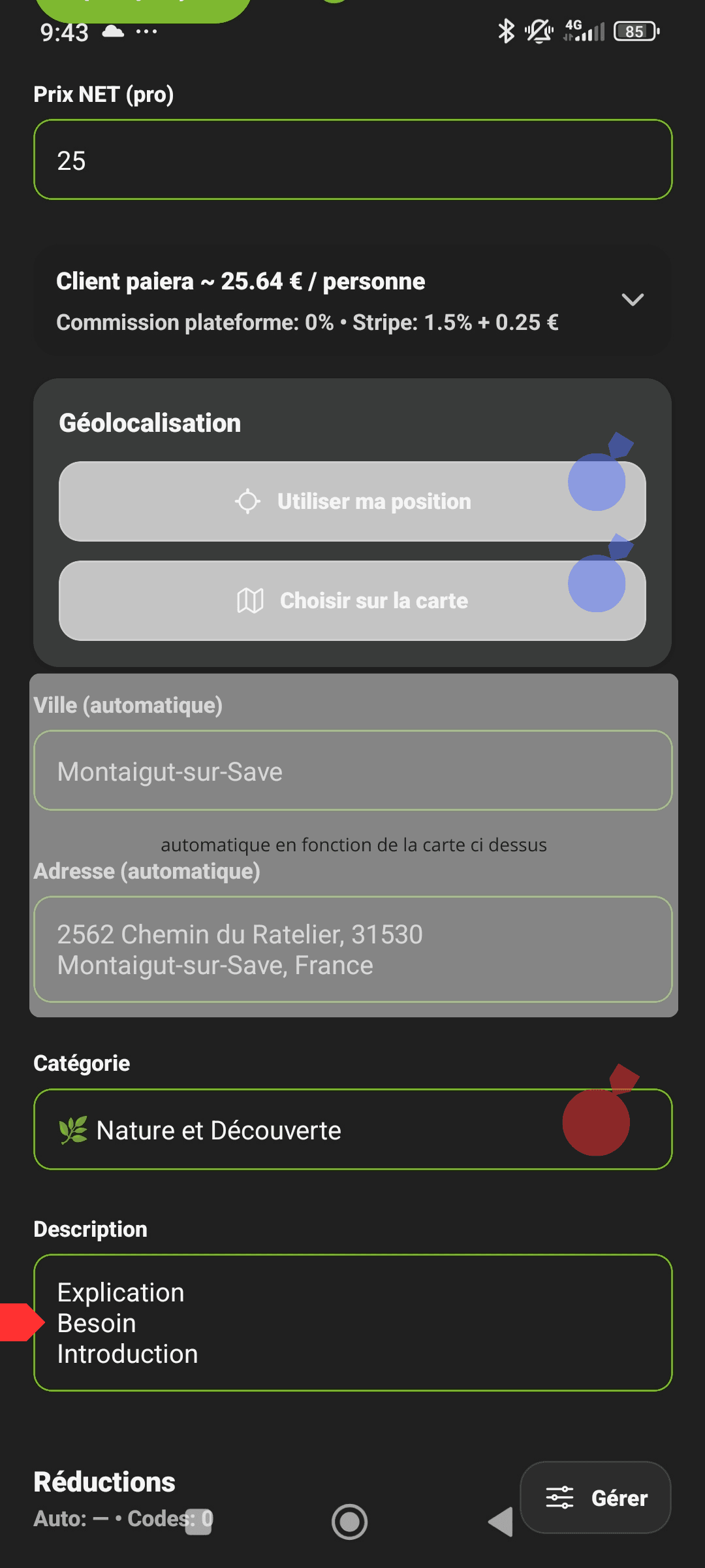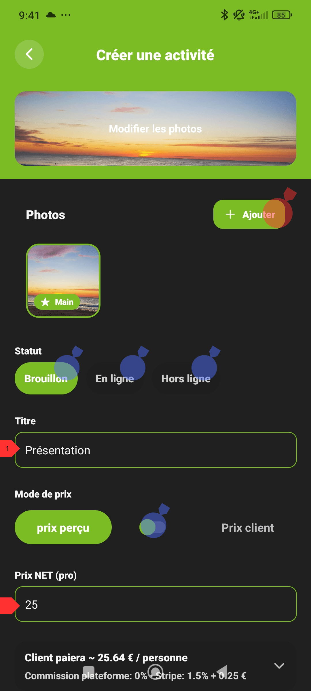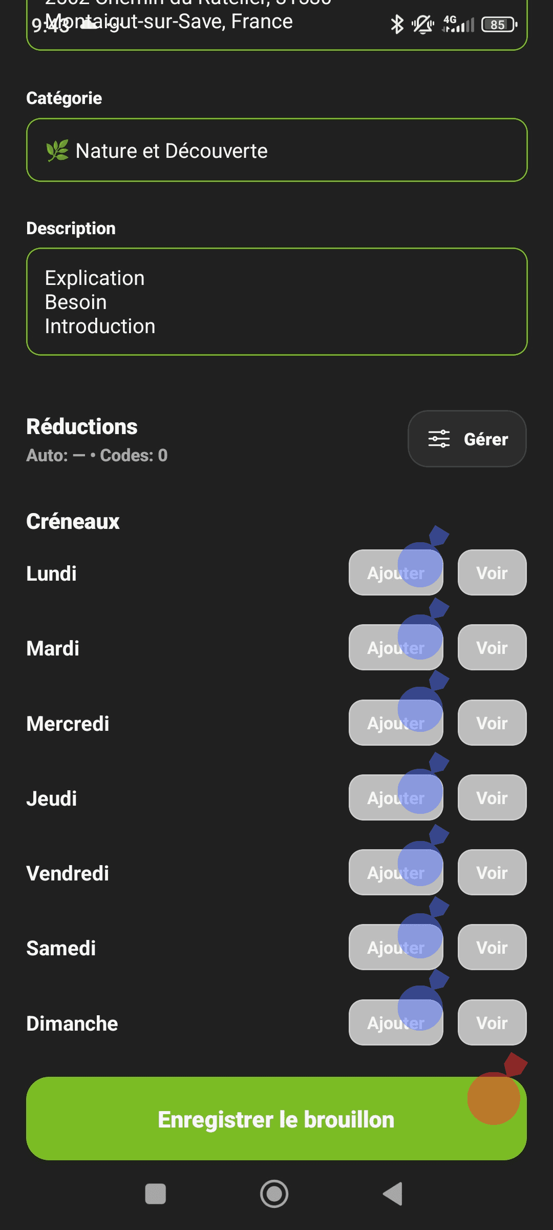 Cette section décrit la procédure complète de création d’une activité côté professionnel.