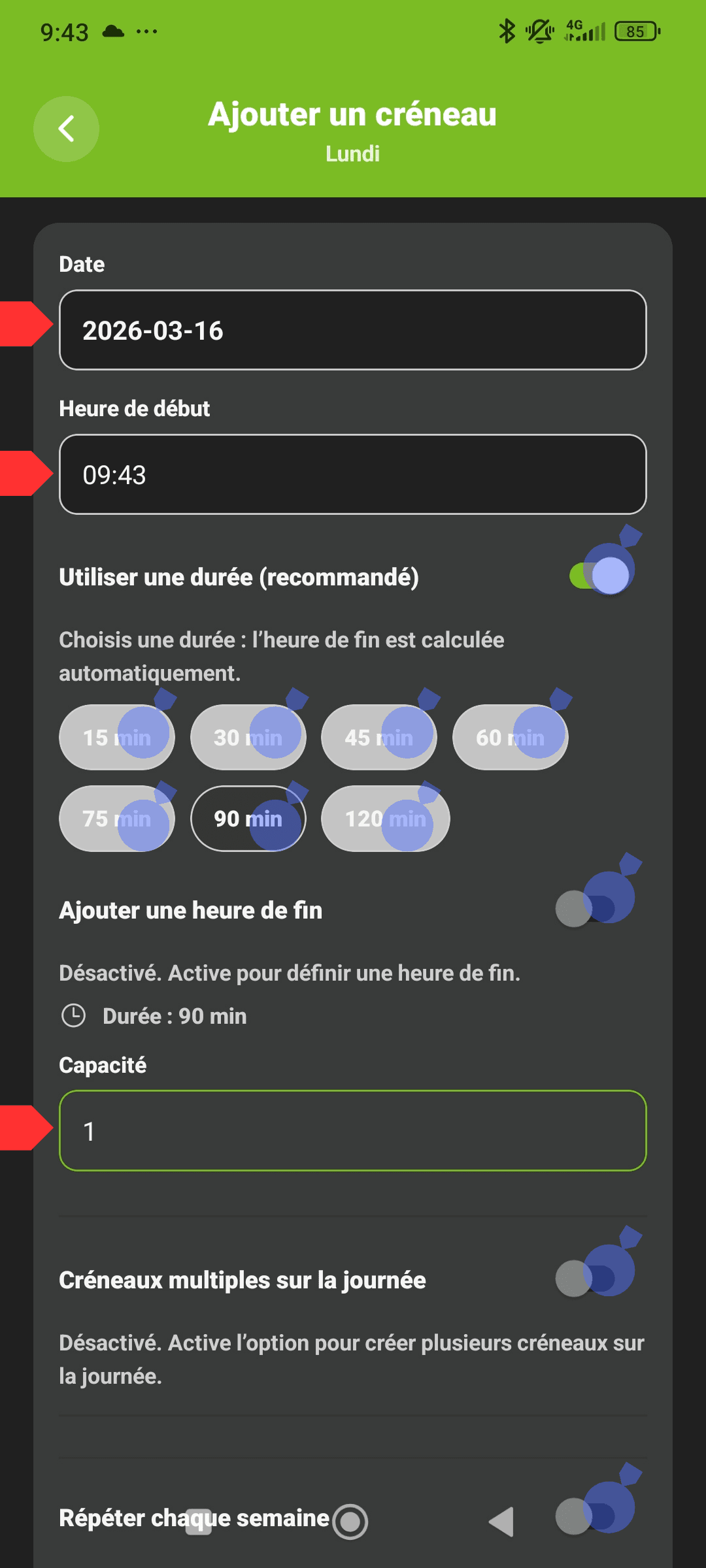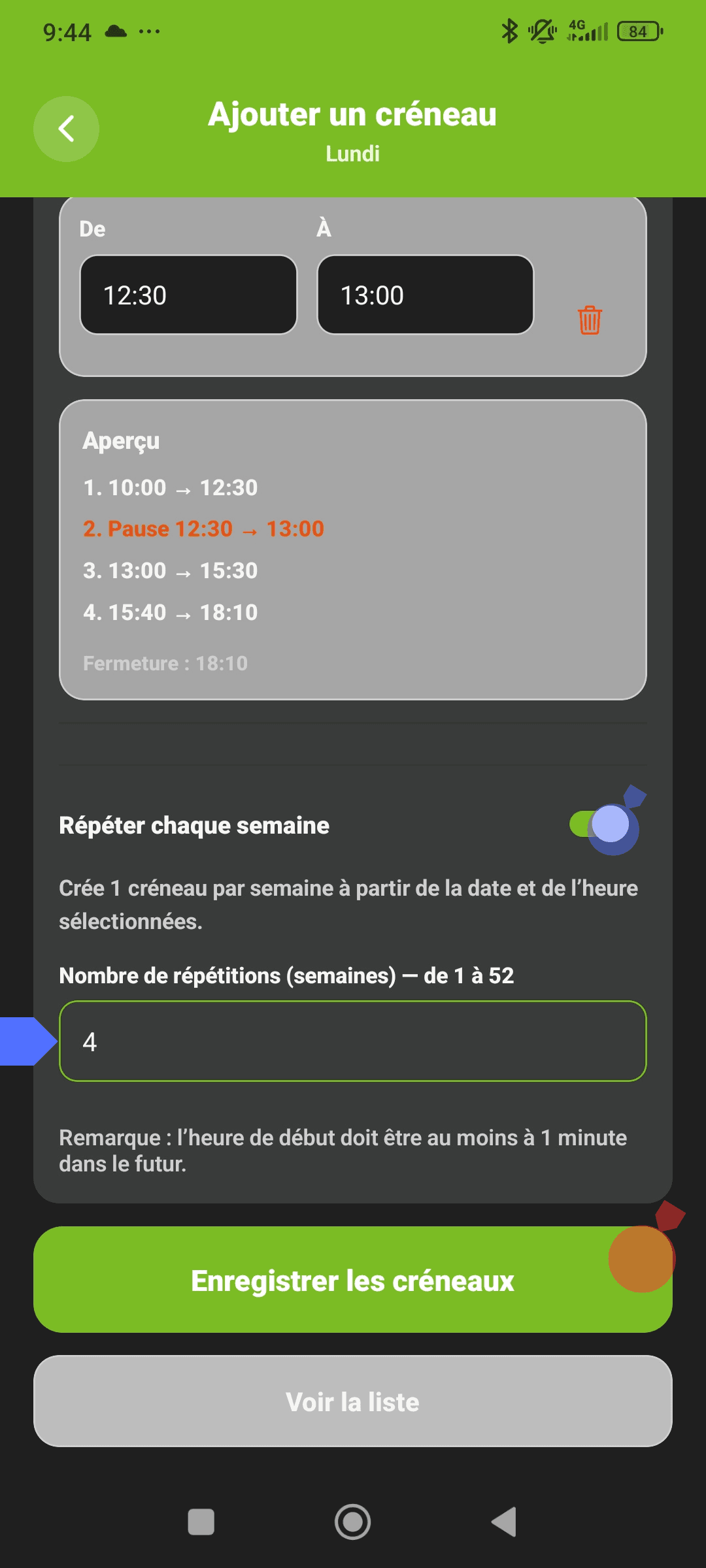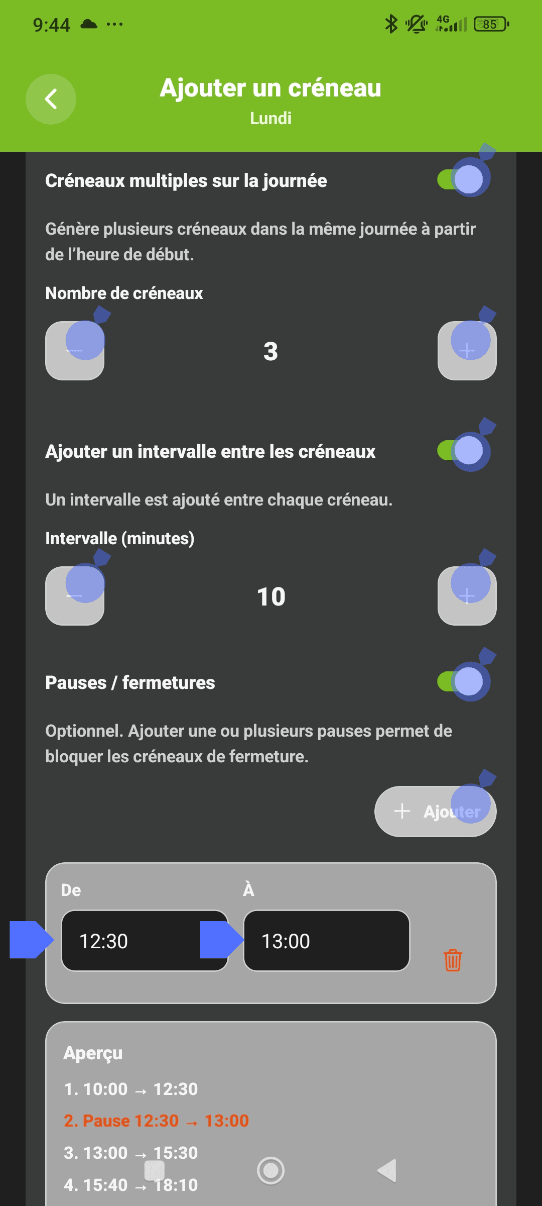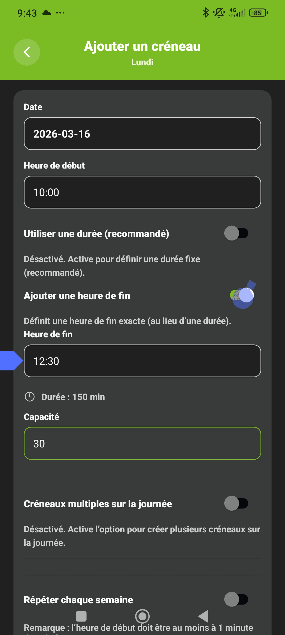 Les créneaux seront générés automatiquement selon les paramètres définis.